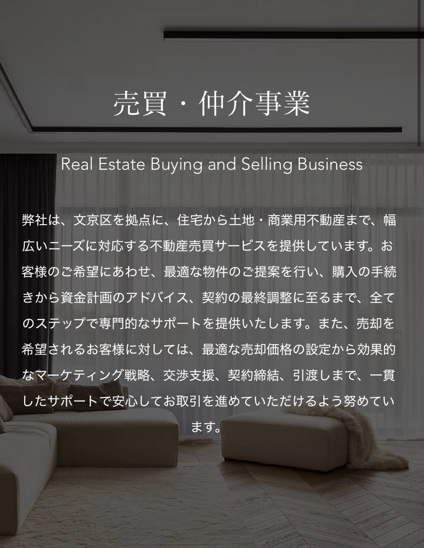 同社は文京区を拠点に、一都三県で土地・戸建て・マンションの売買・仲介を手がけています。住環境やアクセス性にもこだわった物件を扱っているようで、居住用を中心に幅広いニーズに対応していると見られます。