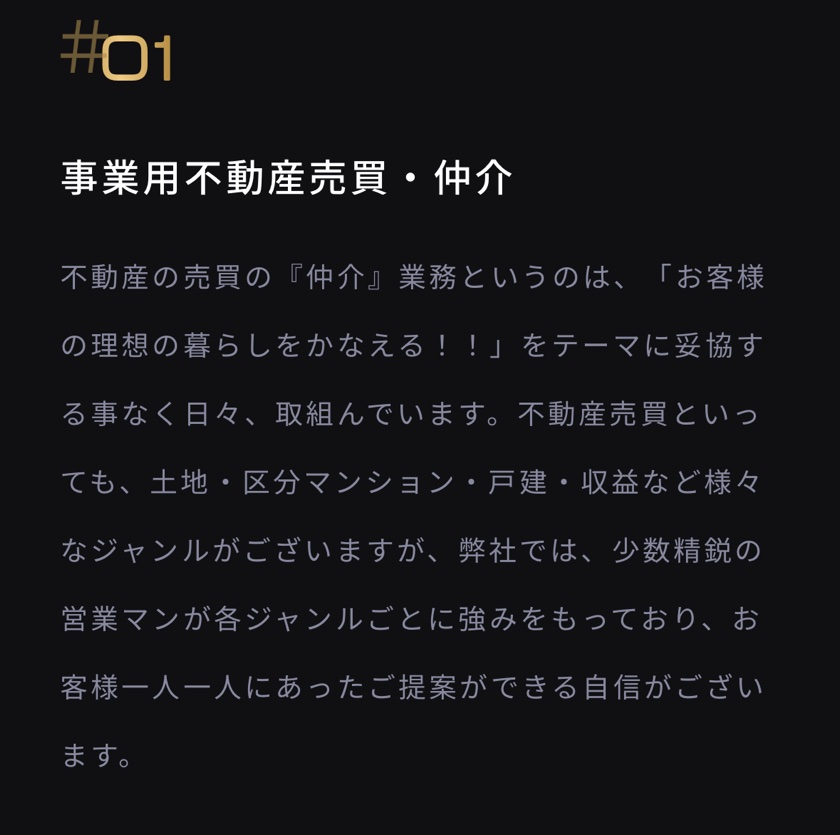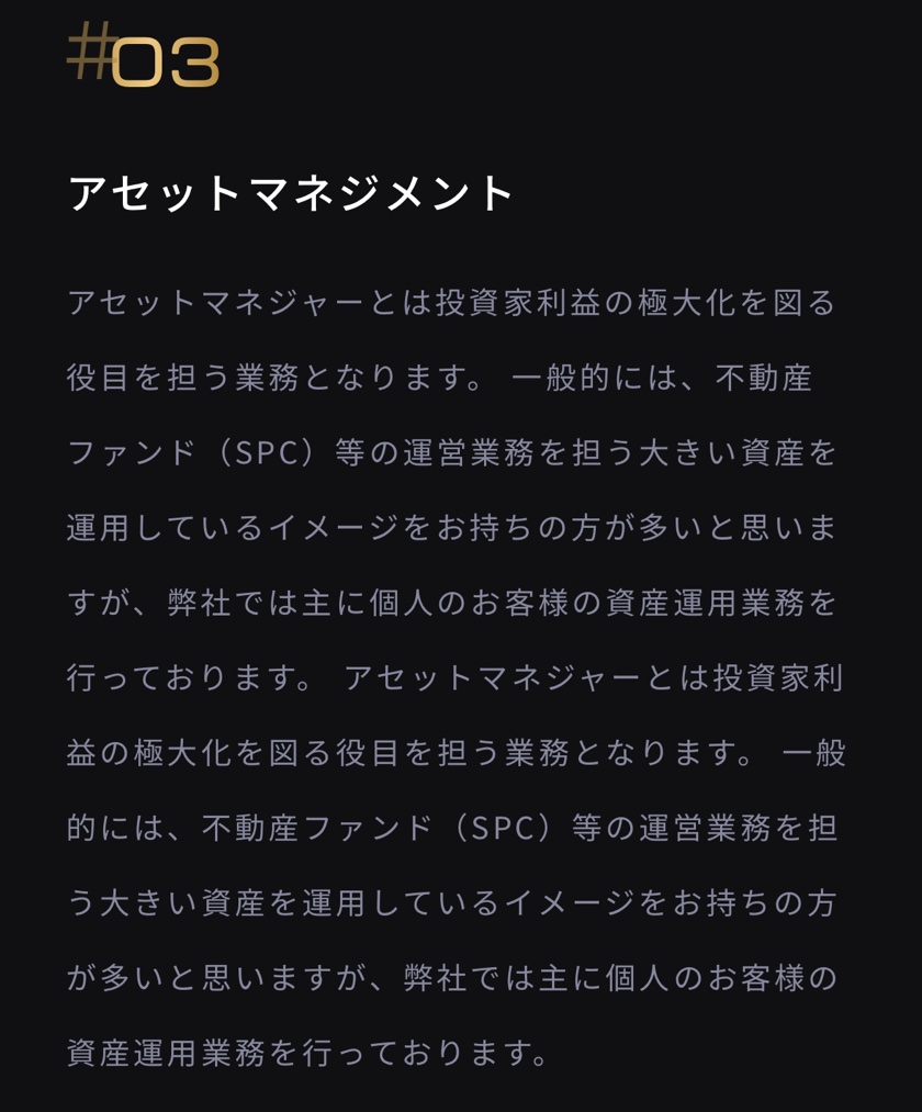 同社は事業用不動産の売買・仲介を掲げつつ、居住用不動産の取り扱いやアセットマネジメント、リノベーションにも対応しているようです。ただ、そのどこまでが投資家向けの「収益物件」を前提としたサービスなのか、公式サイトの情報だけではやや判然としない印象もありました。