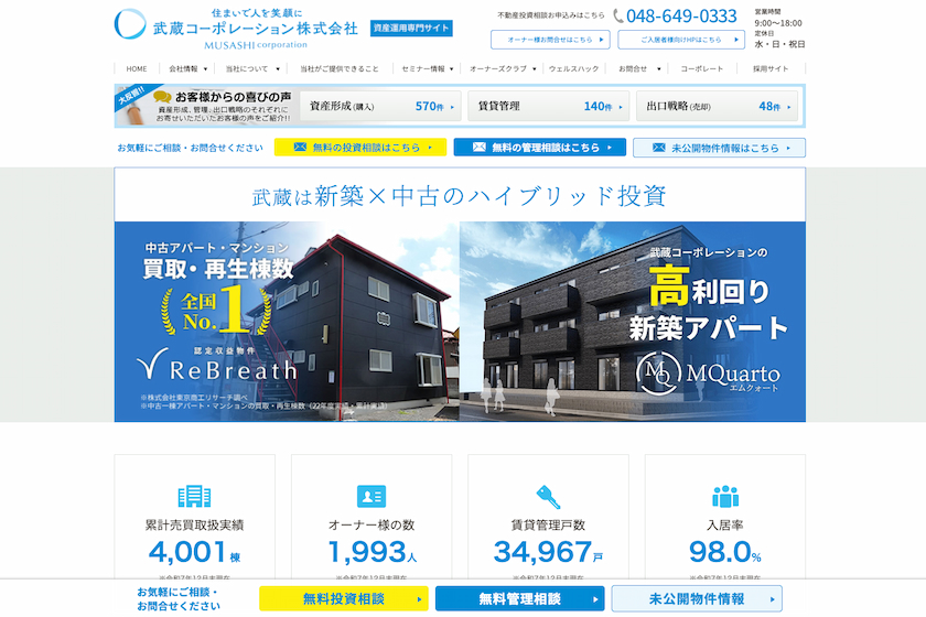 武蔵コーポレーションは、富裕層を対象に関東エリアに絞って収益用の不動産を展開している不動産会社です。また、新築物件、中古物件のみに限らず、節税などのニーズに合わせて新築と中古物件を合わせた投資方法も提案もしてくれます。