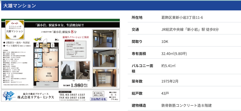 株式会社リアル・ミンクスは東京都新宿区を拠点にしている不動産会社。2017年創業、主に一都三県の不動産を提案しつつ、物件の再生事業も手がけているようです。