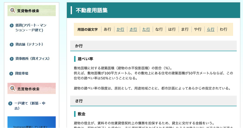 昭栄不動産は公式サイトで不動産に関する用語集を公開しているようです。全体的に情報量が多く、基本的な知識を補完するうえでは役立つかもしれません。